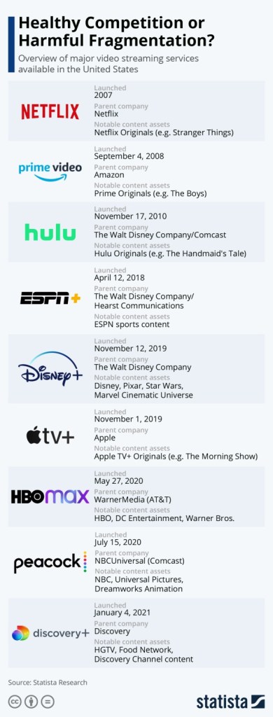Kabul edelim ki, müşterinin “içeriğe” önem vermesi pazarın nasıl şekilleneceğini doğrudan etkileyen faktör. Statista’nın Ocak.2021 tarihli raporuna göre, pazara yeni oyuncu girdikçe, içerikler platformlar arasında fragmente oluyor. Dolayısıyla, mevcut platformu kullanan müşteri “yeni bir deneyime”, aylık bütçesine “yeni bir gider kalemi” ekleyerek dahil olmak zorunda kalıyor.