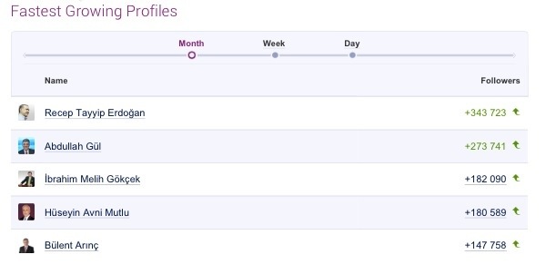 Bir de son 1 ayda Twitter’da follower adedi artışına hesaplar bazında bakalım.